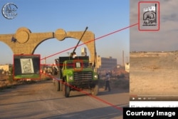 По кадрам видеозаписей авторы расследования смогли подтвердить, что Телль-Биса на момент удара находилась именно под контролем группировки "Джейш-аль-Тавхид" - об этом свидетельствует, в частности, эмблема группировки, размещенная на одном из автомобилей на видео: