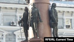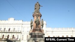 Речь идет о так называемом "памятнике основателям" Одессы на Екатерининской площади. Главная фигура скульптуры – российская императрица Екатерина II, а у подножия пьедестала стоят Иосиф де Рибас, инженер Франц-Павел де Волан, фельдмаршал Григорий Потемкин и Платон Зубов.