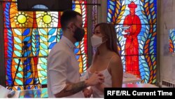 Но если расписаться Искандер и Юля успели в ЗАГСе, то свадебную вечеринку пришлось проводить по всем рекомендациям Минздрава: санитайзеры, жених и невеста в медицинских масках, тосты и поздравления – бесконтактные.