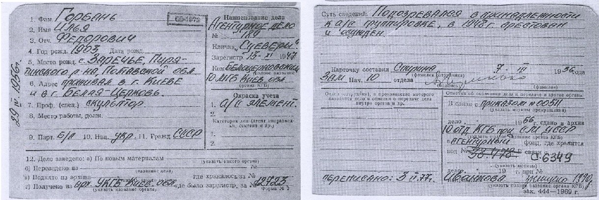 Карточка учета Горбаня по делу "Суеверы". Внизу справа запись об уничтожении дела