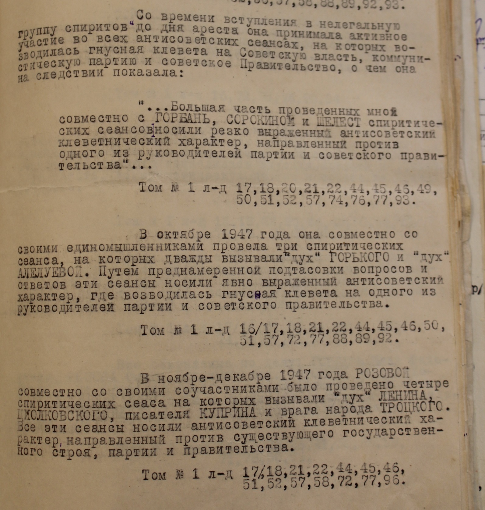Так в протоколах допросов описаны почти все контакты подозреваемых с духами. Они, конечно, так не говорили, но записано именно так. Конкретные вопросы, заданные известным покойникам, и ответы из загробного мира спрятаны за одинаковыми казенными формулировками. В чем именно заключался антисоветский характер "общения", из материалов следствия вообще непонятно. Можно лишь догадаться, что за формулировкой "один из руководителей..." скрывается Сталин. Такая "стеснительность" при пересказе выпадов против первых лиц партии сохранялась в чекистских документах вплоть до перестроечных лет.