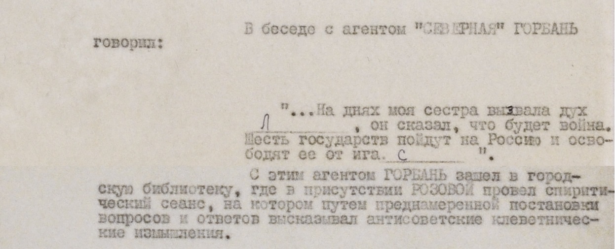 "С этим агентом Горбань зашел в городскую библиотеку (напомним, там находилась квартира Розовой – НВ), где в присутствии Розовой провел спиритический сеанс, на котором путем преднамеренной постановки вопросов и ответов высказывал антисоветские клеветнические измышления", – говорится в том же сообщении.