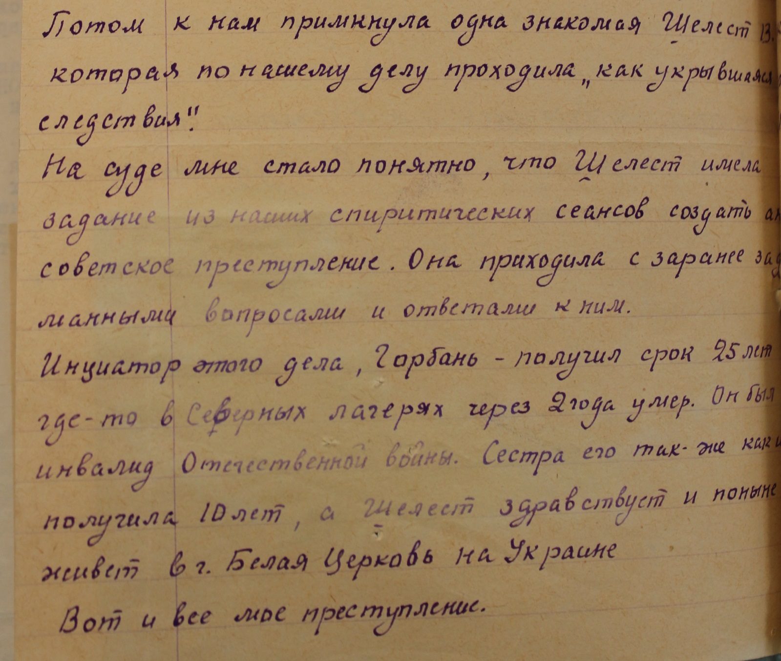 "Проводя антисоветские спиритические сеансы, я тем самым старался опорочить и оклеветать Советскую власть и руководителей Партии и Правительства, и показать своим соучастникам слабость советской власти и "бездарность" ее руководителей", – гласит протокол допроса Горбаня.