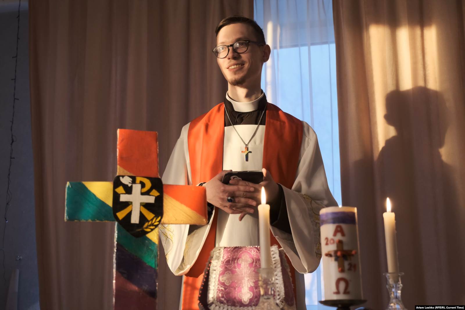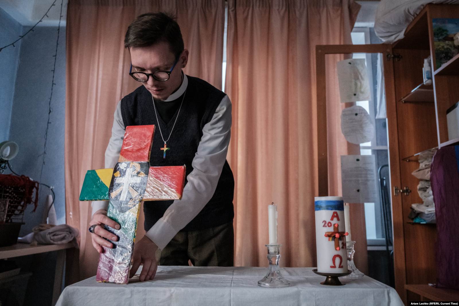 На столе перед Александром – ноутбук с фотографией Мартина Лютера Кинга и цитатой "I have a dream..." на заставке. Священник раздает прихожанам распечатки молитв. Портативная колонка, из которой доносятся гимны. Разноцветный крест, скатерть, чаша для богослужений.